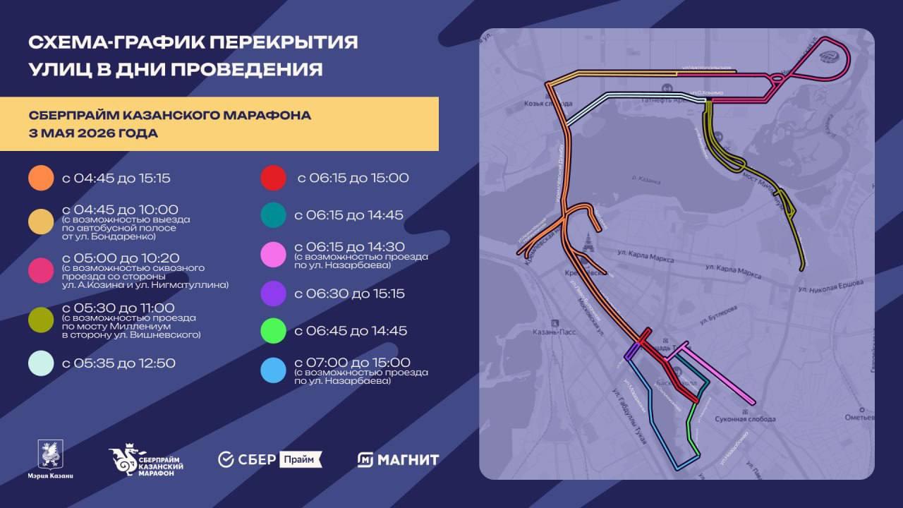 Администрация Казани опубликовала схемы перекрытий улиц, связанных с проведением Казанского марафона. Ограничения продлятся с 1 по 3 мая, а на некоторых участках начнутся уже 27 апреля.