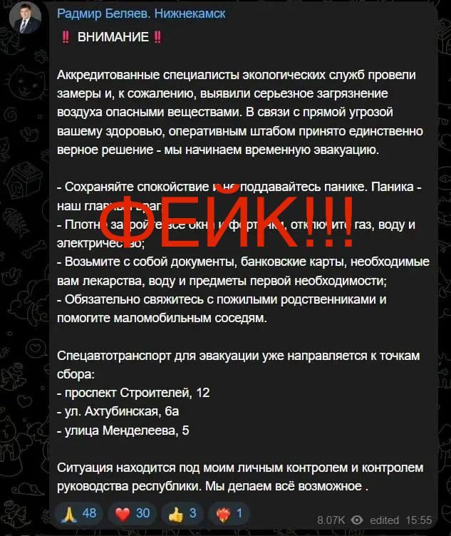 Кроме того, неизвестные создали поддельную страницу в Telegram, которая выдаёт себя за официальный канал главы города Радмира Беляева. На этой странице публикуются призывы к «временной эвакуации» из-за мнимого загрязнения воздуха.