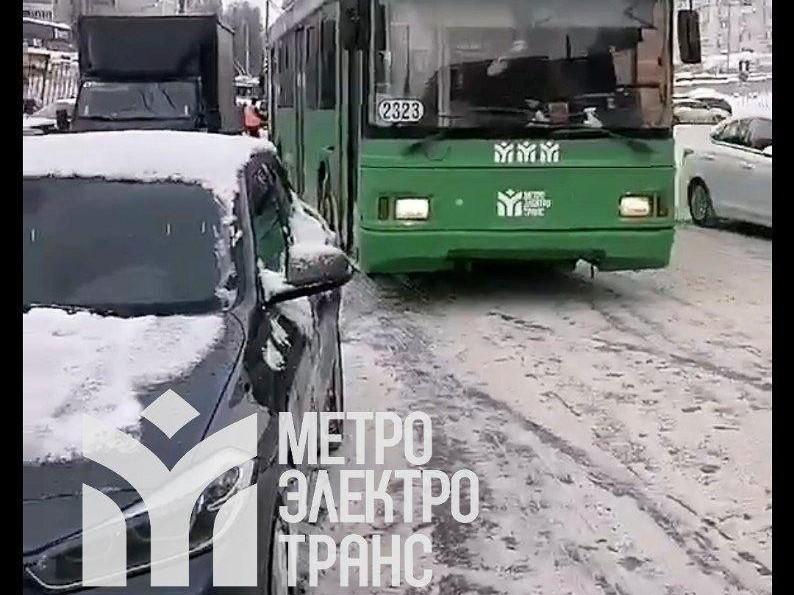 Инцидент произошёл 17 февраля в дневное время на улице Фучика в Казани. После снегопада автомобиль BMW был оставлен на проезжей части под контактными сетями, что полностью заблокировало путь для троллейбусов.