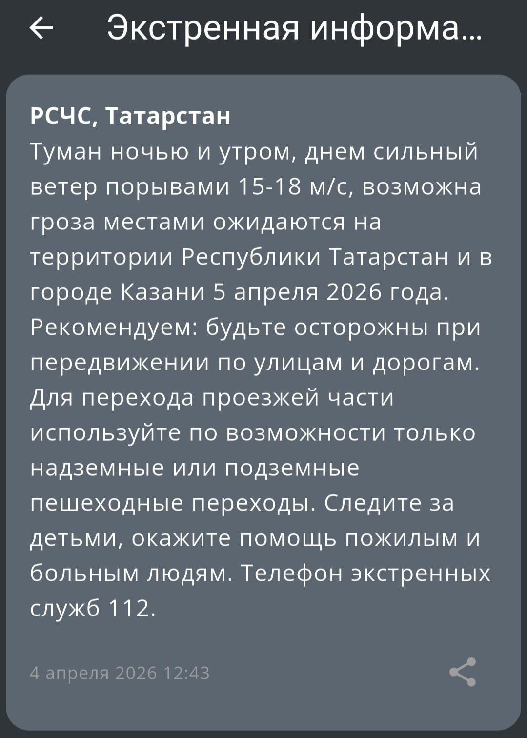 Днем 5 апреля в Казани возможна первая в этом сезоне гроза. Гидрометцентр Татарстана выпустил сообщение об ухудшении погодных условий, а МЧС разослало оповещения жителям республики.